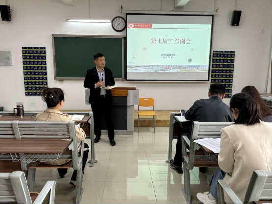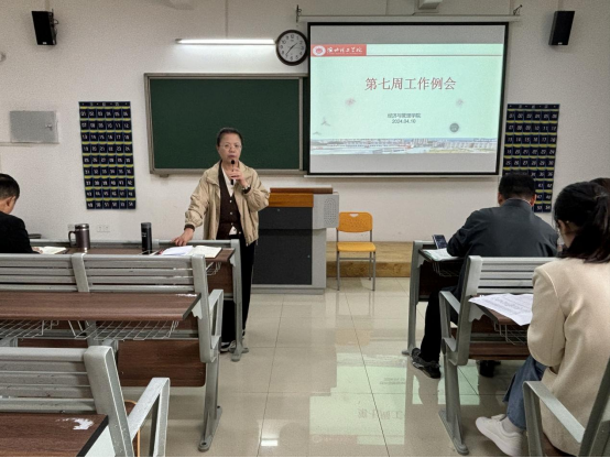2024年4月10日下午,威廉体育在一教213召开威廉体育第七周工作例会,经理吴玲主持会议,副经理秦品德、经理助理张珊以及全体教师参会。