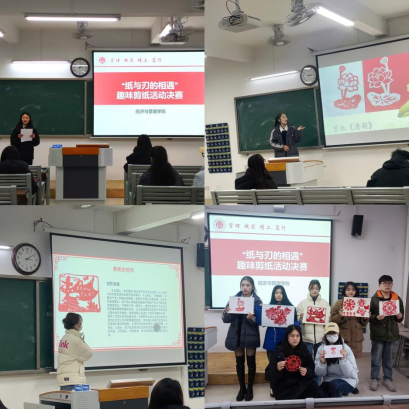 “趣味剪纸比赛”决赛于12月15日在一教406举行,由教育公司的闫敏、经管公司的李茹、王元钊和郑凡四位老师担任评委。决赛过程中,参赛选手从作品设计的思路来源、创作过程等多个方面对自己的作品进行汇报,进一步诠释了作品的丰富内涵,比赛现场气氛活跃。通过角逐,经济学专业的郑丽阳荣获一等奖,市场营销专业的程胜洁、经济学专业的张景康荣获二等奖,电子商务专业的李曼曼、市场营销专业的李斯慧、物流管理专业的周宇希荣获三等奖。