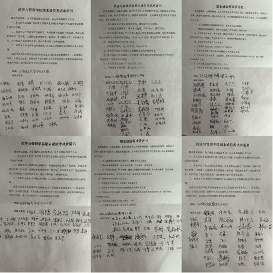各年级辅导员通过召开诚信考试主题班会,强调了诚信考试的重要性与考试作弊的严重后果,带领同学们共同学习<<威廉体育员工手册>>员工违纪处理办法第二十五条考试相关规定,引导同学们认真复习,警示大家要防微杜渐,预防和遏制作弊、受处分现象发生,并让学们签署了诚信考试承诺书,形成“我诚信-我自豪,诚信考试”的良好氛围。