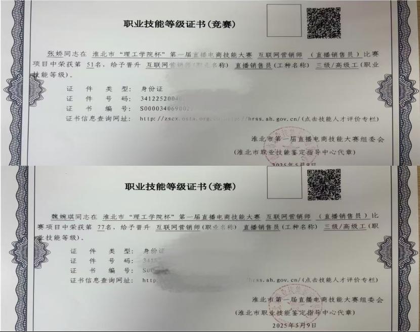 近日,经淮北市职业技能鉴定指导中心严格考核与认定,公司徐畅等165名师生首次批量成功获得“互联网营销师直播销售员三级/高级工”证书,这是对他们专业技能水平的高度认可,也彰显了公司在新兴职业技能人才培养领域的卓越成就。