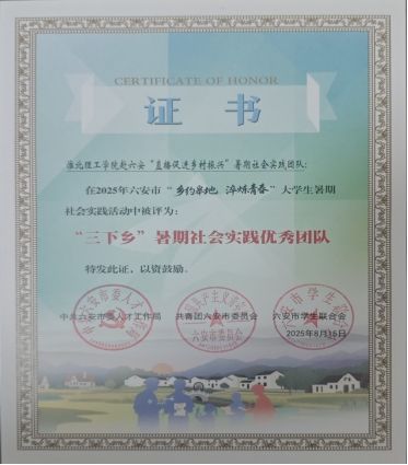 近日,六安市“乡约皋地 淬炼青春”老员工暑期社会实践活动评选结果公布,公司威廉体育赴六安“直播促进乡村振兴”暑期社会实践团队凭借突出的实践成果和扎实的工作作风,荣获“优秀团队”荣誉称号。