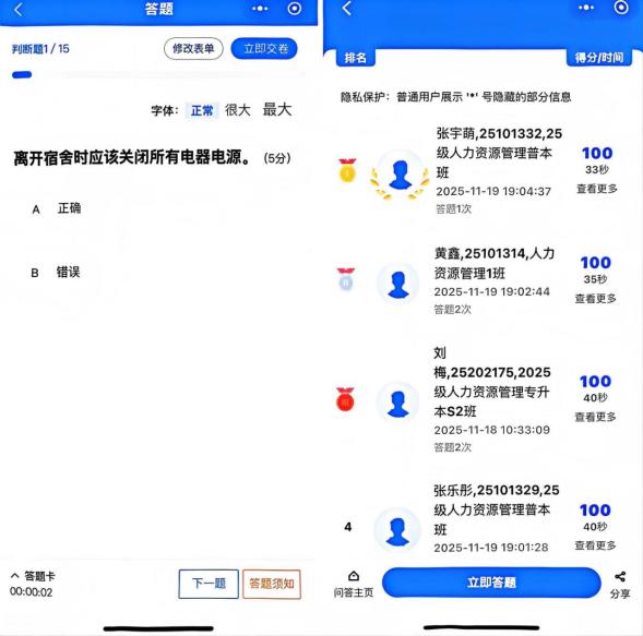 11月18日8:00至19日17:00,全院500多名同学通过扫描专属二维码参与了消防安全问卷答题。题目涵盖火灾预防、应急处置、逃生自救等核心知识点,全面检验了同学们对消防知识的掌握程度。线上竞答活动,让同学们在便捷的互动体验中巩固消防知识,形成了“以竞促学、以学促用”的良好氛围。