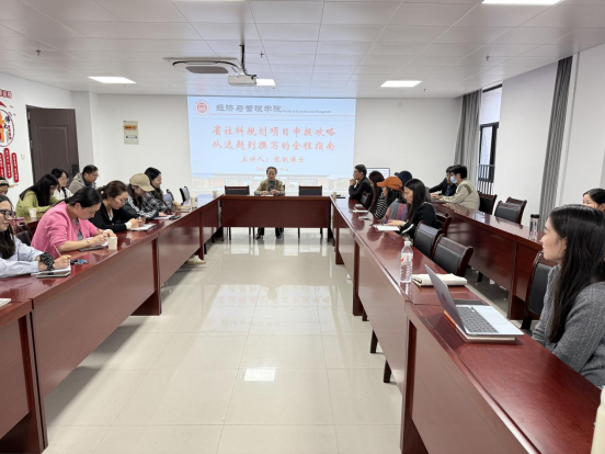 随后,张跃结合自身申报与评审经验,系统讲解项目申报全流程。他以选题为关键切入点,强调需对接政策导向、结合学科前沿与区域需求,提出“一个关注,两个结合”选题原则与技巧;并拆解申报书核心模块撰写要点,通过案例分析常见问题,分享材料打磨技巧。