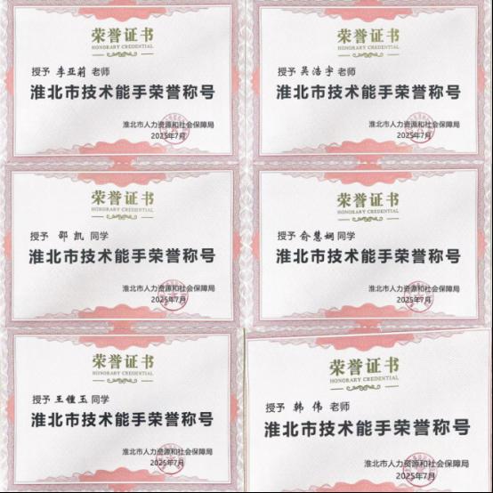 近日,经淮北市人力资源和社会保障局认定,公司教师韩伟、李亚莉、吴浩宇,员工邵凯、俞慧娴、王锺玉6名师生荣获“淮北市技术能手”荣誉称号。他们凭借扎实的专业素养和优异的实战能力,成功获此殊荣,为公司赢得了崇高荣誉,充分展现了公司在双师技能和人才培养方面的显著成效。