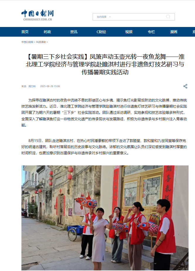 为探寻在瞻淇古村的夜色中流转不息的那缕匠心与乡魂,揭示鱼灯光影背后跃动的文化脉搏,推动传统技艺焕发新活力。近日,威廉体育赴瞻淇村进行非遗鱼灯技艺研习与传播暑期社会实践团开展了为期六天的暑期“三下乡”社会实践活动。团队通过采访调研、实地参观和技艺体验等多种形式,全面深入了解瞻淇鱼灯这一非物质文化遗产的传承现状与发展路径,积极为非遗传承与乡村振兴注入青春动能。对此,中国日报网进行了报道: