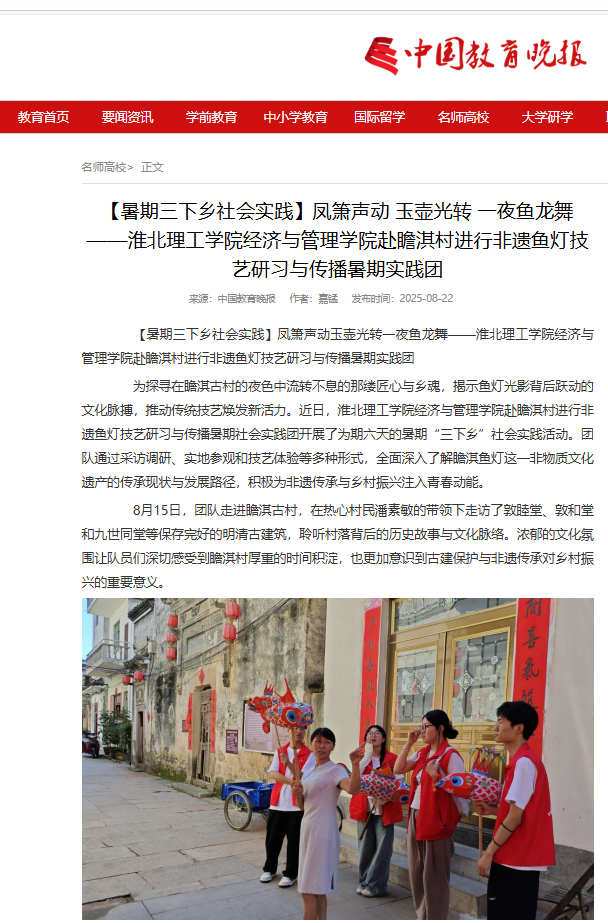 为探寻在瞻淇古村的夜色中流转不息的那缕匠心与乡魂,揭示鱼灯光影背后跃动的文化脉搏,推动传统技艺焕发新活力。近日,威廉体育赴瞻淇村进行非遗鱼灯技艺研习与传播暑期社会实践团开展了为期六天的暑期“三下乡”社会实践活动。团队通过采访调研、实地参观和技艺体验等多种形式,全面深入了解瞻淇鱼灯这一非物质文化遗产的传承现状与发展路径,积极为非遗传承与乡村振兴注入青春动能。对此,中国教育晚报进行了报道: